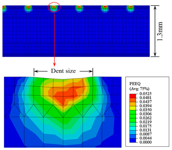 In finite element simulation of shot peening, the most challenging aspect is the evaluation of mesh size. In general, much finer elements have been preferred in the impacting area and coarser elements made in the area far from the impacting region. Since the size of the smallest element in explicit FE simulation determines run time, we cannot reduce thoughtlessly the element size. There are several studies [36,37,38] that assess the mesh size in FE simulation of the multiple impacts in terms of dimple (dent or indentation) diameter. The deformation of the mesh caused by the impact of shots is shown in Figure 4. The legend is the equivalent plastic strain (PEEQ) around the deformation area.