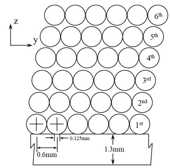 where Ro is the peening coverage, Ds is dent size, Cd is the distance between the centers of shots; and Nl defined in Equation (2) characterizes the number of dents between the centers of the shot. As shown in Equation (2), the number of dents Nl is determined by Cd, Ds, and the coefficient of proportionality (a). The coefficient of proportionality can be determined by the overlapping dents of the shot impacts [28]. The dent size is related to the size of the ball and the impact velocity. The horizontal distance between the centers of shots (Cd) is twice the radius of the shots. The effectiveness of the quantitative description of peening coverage will be proved in Section 3.