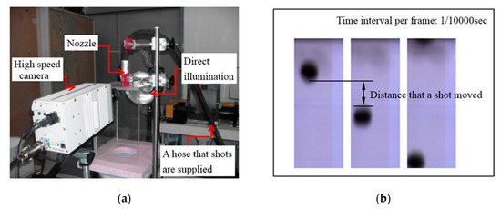 An air-compression type shot peening equipment is developed for this research. A cut wire round shot S230 (Diameter = 0.6 mm) is used for the shot materials in the Almen test. Mass flow rates of shots are approximately 2.5 kg/min. This equipment can propel shots with sizes up to 1/16 inch in diameter. The desired impact velocities are obtained by adjusting the air pressure and impact distance. A high-speed camera (Motion Xtra HG-LE, Redlake (USA)) is employed to measure the impact velocity (Figure 6). A number of frames used for measuring the impact velocity are 10,000 fps. When air pressure is 0.3, 0.5, 0.7 MPa, the impact velocity measured is 25, 30, and 35 m/s respectively. The distance from the nozzle to the surface of the Almen strip is 100 mm and the impact angle is 90°, which is typical for shot peening tests.