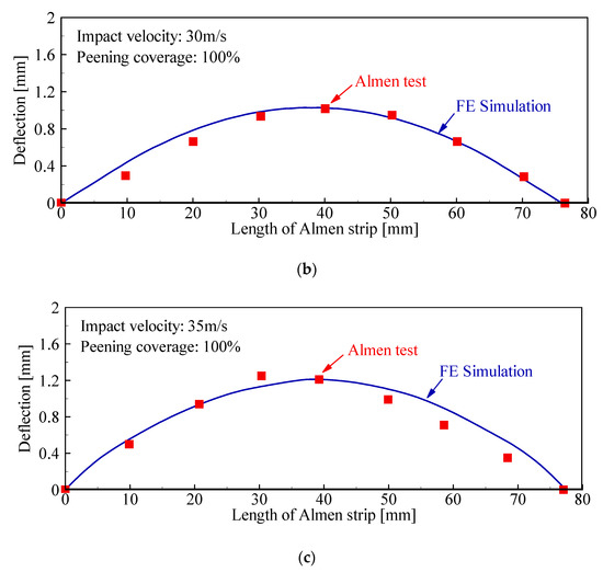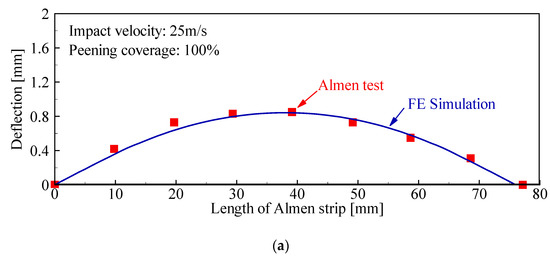 Based on the quantitative description of peening coverage (Equation (1)), the finite element simulation of the Almen test is carried out. Meanwhile, the Almen test is also carried out. By comparing the results of the finite element simulation and Almen test, the effectiveness of the quantitative description of peening coverage and the FE simulation are proved.