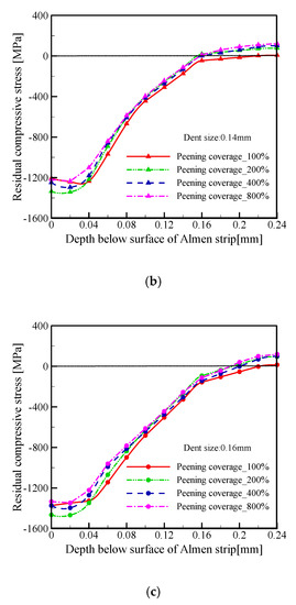 The peening coverage is 100%, 200%, 400% and 800%. The dent size of three cases is 0.125, 0.14, and 0.16 mm. With three dent sizes, the distribution of the RCS at different depth is shown in Figure 10 respectively. Figure 10a shown distribution of the RCS at 0.125mm of dent size. Figure 10b,c shows the dent size at 0.14 and 0.16mm, respectively.