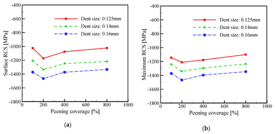 With dent size of 0.125, 0.14, and 0.16 mm, a more detailed analysis of peening coverage and RCS is shown in Figure 11. Surface RCS is the RCS of the Almen strip surface, while the maximum RCS is the minimum value of RCS at different depth as the value of RCS is negative. Figure 11a shows the relation of the surface RCS and the peening coverage, while Figure 11b shows the relation of the maximum RCS and the peening coverage.