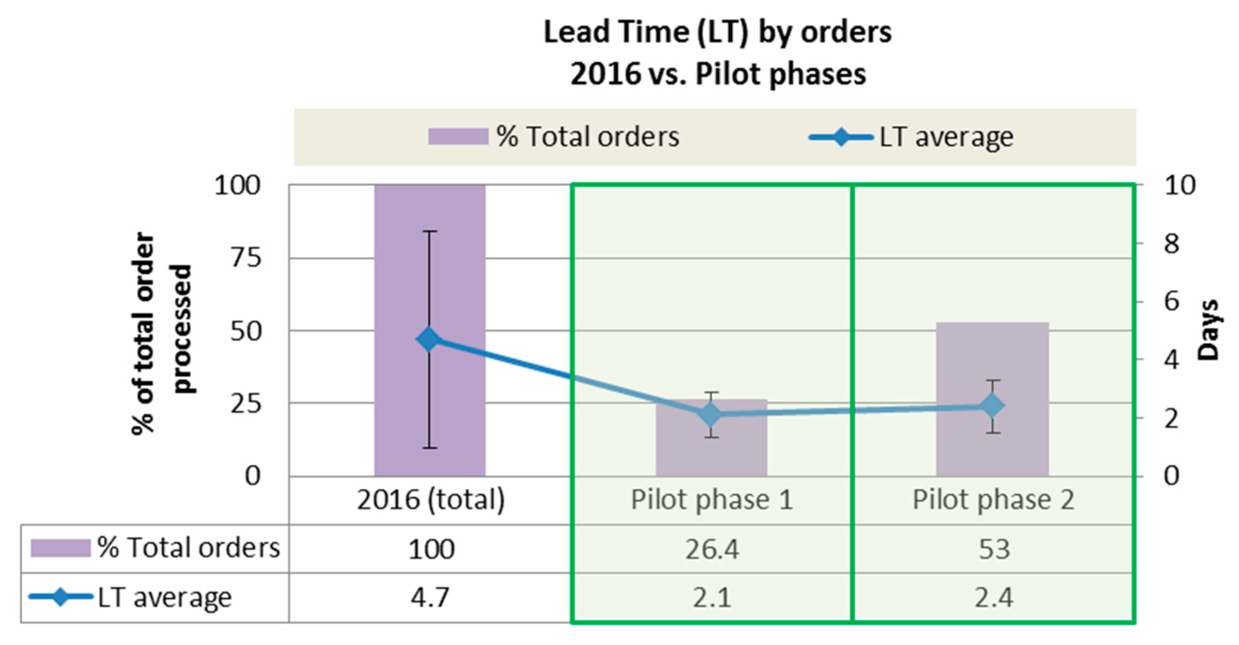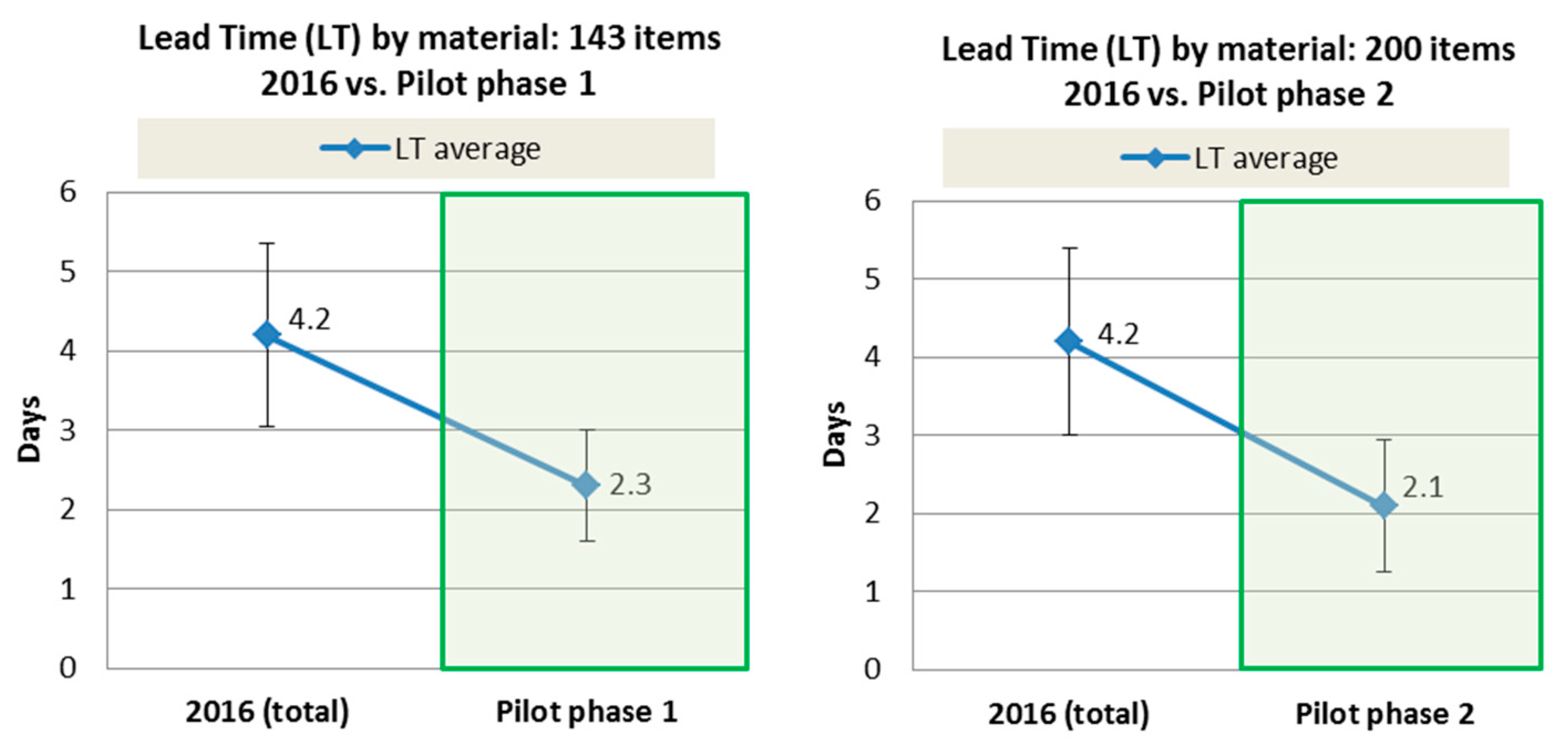 - Pilot phase 2: 10 working days, 53.0% of the total request orders processed with the new process, 200 different types of material references.