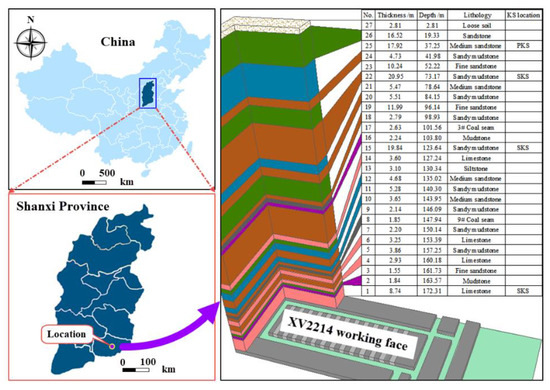 It can be seen from the above that there are four KS in the overburden: namely, the first layer (limestone), 15th layer (sandy mudstone), 22th layer (sandy mudstone), and 25th layer (medium sandstone). A schematic diagram of the coalmine and the KS locations are shown in Figure 1.