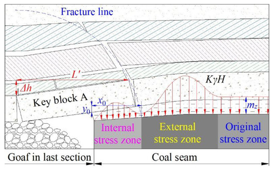 Reasonable coal pillar width should not only ensure the stability of the roadway during excavation, but also ensure the safety of the working face during the mining process. During mining progress at the adjacent working face, the basic roof breaks into the key block at the edge of the goaf and forms an articulated structure with the adjacent rock blocks. The abutment pressure of the overburden transferred to the coal is divided into two parts according to the fracture line, i.e., the internal stress field between the fracture line and coal and the external stress zone in the deep region (it becomes the original stress zone beyond a certain point). Additionally, the stress in the internal stress zone is determined by the weight and movement of the overburden under the fracture line, and the whole surrounding rock is in low stress, which is beneficial to roadway maintenance, as shown in Figure 2.