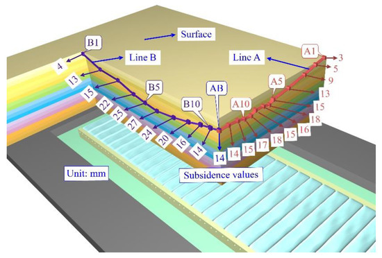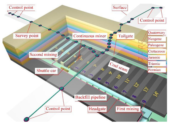Based on the geological conditions, relevant regulations and other factors, the two observation lines (along the strike and inclination) were set up above the XV2214 working face. The Global Navigation Satellite System (GNSS) and Real-time kinematic (RTK) method, a method of GPS measurement, was used for monitoring the surface subsidence, with horizontal accuracy of 3 mm and vertical accuracy of 5 mm after static state. A schematic diagram indicating the backfilling process and layout of the observation lines is shown in Figure 3.