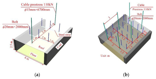 Due to the continuous mining machine used, the roadway was rectangular, supported by the roof and cable bolts, but its two sides were not supported. The parameters of the roof bolts are as follows: 0.1 m in radius by 2 m long with 1 m row spacing. Each row had 3 bolts. The cable was 0.15 m in diameter and 6.7 m long. The cable row spacing along the center line of the roadway roof is 4 m (Figure 4a). If the limestone thickness of the roadway roof in the working face is below 0.5 m or the roof meets the structure, destruction and instability, the roadway shall be strengthened, as shown in Figure 4b.