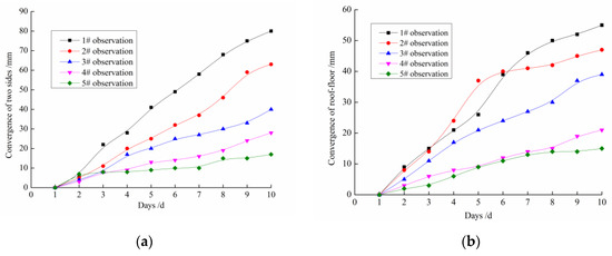 Curve results of roadway deformation: (a) convergence of the two sides; (b) convergence of roof-floor.