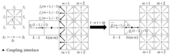 The coupling strategy of the 1D–2D interfaces is implemented at the mesoscopic level, in which the distribution functions are used to couple 1D and 2D submodels. The coupling interface is in the form of a node in the 1D computational domain, and in the form of a line in the 2D computational domain. In this study, the coupling interface was treated as an interior lattice node of the 1D domain, with three unknown distribution functions to be calculated. These unknown distribution functions at the coupling interface were calculated by the distribution functions and macroscopic variables from the adjacent 1D and 2D lattice nodes. The reformulation of the unknown distribution function is depicted in Figure 1, in which denote distribution functions of the 1D domain, denote distribution functions of the 2D domain, k refers to the position of the coupling node at the 1D domain, j refers to time, and m denotes the position of the coupling node at the 2D domain.
