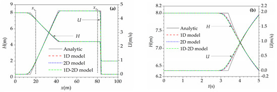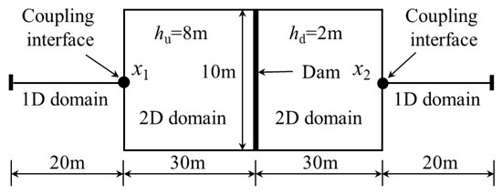 The dam break flow in a frictionless and flat rectangular channel was simulated, and its analytic solutions are given by Stoker [38]. As shown in Figure 2, the dam was placed across the channel at the middle plane of the domain, and the initial water depths at the upstream and downstream sides were set to 8 m and 2 m, respectively. In simulations, the channel was divided into three domains, with the middle domain simulated by the 2D submodel, and the two outer domains simulated by the 1D submodel. The upstream and downstream boundaries were set to constant water depths. The lateral boundaries of the 2D domain were treated as no-slip wall boundary conditions. x1 and x2 were the coupling interfaces, which were located at the inlet and outlet boundaries of the 2D domain, respectively. The initial velocity was zero. When the dam collapsed completely in a sudden, two bores propagating in the upstream and downstream directions, respectively, were generated.