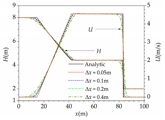 Firstly, the grid convergence of the 1D–2D coupled model was analyzed, and the lattice spacing ranged from 0.05 m to 0.4 m, with each one doubled from the former. As shown in Figure 3, the numerical results approached the analytic solution as the mesh became finer. But as the mesh became very fine, such as lattice spacing 0.05 m and 0.1 m, the result differences between them were very small. To get an accurate solution and to improve the computational efficiency, the lattice spacing of 0.1 m was reasonable, which was adopted in the following simulation.
