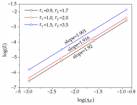 In simulations, unless mentioned otherwise, the values of the relaxation parameters for the 1D and 2D submodels were taken to be and , respectively. We verified the accuracy and stability of the 1D–2D coupled model by analyzing its grid convergence, errors, and convergence rate.