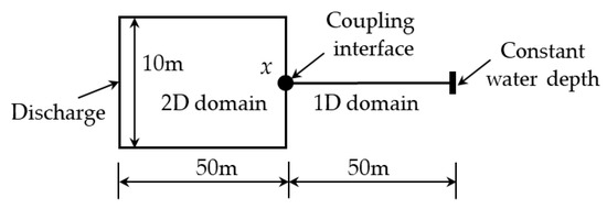 The surge waves in the tailrace canal of a hydropower station caused by load rejection were simulated by the 1D–2D coupled model. The tailrace canal had a constant rectangular cross-section with a length of 100 m, a width of 10 m, a flat bottom, and a Manning roughness coefficient of 0.015. The upstream boundary was a given discharge, which decreased linearly from 600 m3/s to 0 m3/s within 8 s. The downstream boundary was a constant water depth of 15 m. The lateral boundaries of the 2D domain were treated as no-slip wall boundary conditions. As depicted in Figure 6, the 2D submodel and 1D submodel were used to simulate the upstream half part and downstream half part of the domain, respectively. The interface was at x = 50 m, which was also at the outer boundary of the 2D domain. The lattice spacing was 0.2 m, the time step was 0.01 s, and the relaxation parameters were and .