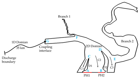 The surge wave propagation and reflection phenomena caused by a load rejection in a run-of-river hydropower station were simulated to further demonstrate the capability of the proposed 1D–2D coupled model. The hydropower station, the reservoir, and the computational domain are depicted in Figure 8. The reservoir was divided into three parts (Channel 1 (C1), Channel 2 (C2), and channel 3 (C3)) by two dikes (Dike 1 (D1) and Dike 2 (D2)). Two powerhouses—Powerhouse 1 (PH1) and Powerhouse 2 (PH2)—were located at the end of Channel 2. Powerhouse 1 included 14 turbines, with a total discharge of 11550 m3/s, and Powerhouse 2 included seven turbines, with a total discharge of 6385 m3/s. Channel 1 and Channel 3 were used for sand washing and shipping. There were two side branches: Branch 1 was 7.7 km, and Branch 2 was 2.2 km. Several monitoring points were set to record the flow parameters. Point A was located at the inlet of Powerhouse 1, Point B was located at the inlet of Powerhouse 2, Point C was located at the head of Dike 1, Point D was located at the head of Dike 2, Point E was located at the estuary of Branch 1, Point F was located at the estuary of Branch 2, and Point G was located at the coupling interface.