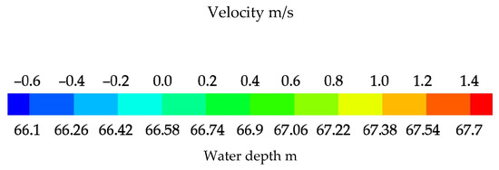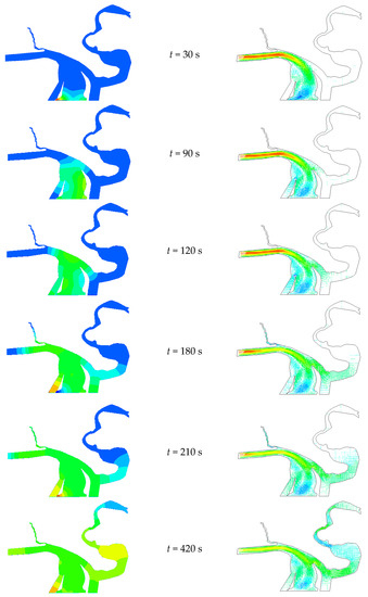 The steady flow simulation was conducted at first, and its results were used as the initial conditions for the transient simulation. The transient process simulation was caused by the load rejection of all units in two powerhouses simultaneously, and the discharge decreased linearly to zero within 40 s. The water depth and velocity at six typical moments are shown in Figure 9.
