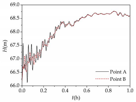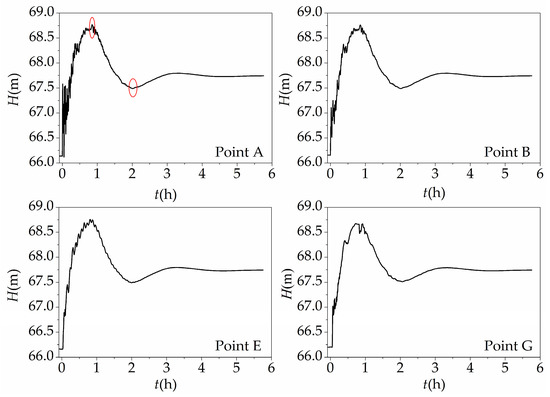 To analyze the fluctuation of water depth at each important building of the hydraulic project, Figure 10 shows the histories of water depth at some monitoring points. Many information could be extracted from the monitoring data, such as the first moment affected by the surge waves, the maximum and the minimum water depths, and the attenuation duration of the surge waves. Take point A, for example, the maximum and the minimum water depths were 68.77 m and 67.49 m, which occurred around 0.85 and 2 h, respectively. The time for the surge wave to attenuate completely was about 5 h.
