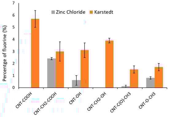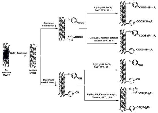 In a previous study [], our group reported on the functionalization of oxidized CNTs (using oxidative acid treatment) with hydrosilane as an anchoring molecule. Specifically, we used a fluorine-bearing hydrosilane, diisopropyl(3,3,4,4,5,5,6,6,6-nonafluorohexyl) silane, which is also referred to as Rf(iPr)2SiH. We compared two different catalysts—zinc chloride (ZnCl2) and Karstedt’s catalyst (1,3-divinyl-1,1,3,3-tetramethyldisiloxane platinum (0) complex). CNTs oxidized by concentrated acids, bearing several different oxygenated functional groups, reacted differently with each catalyst. We hypothesized that the zinc chloride catalyst allowed for reactions involving only carboxyl groups, while Karstedt’s catalyst facilitated reactions of both alcohol and carboxyl groups that were introduced during oxidative acid treatment.