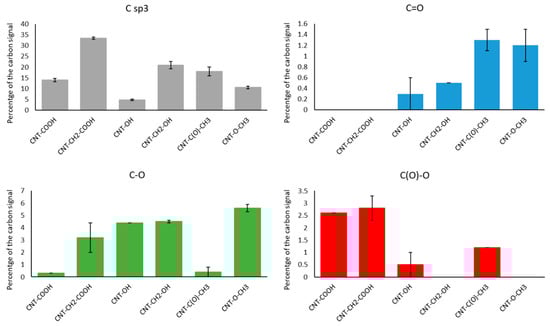 When assessing functionalization via C1s peak fitting, it was found that MWNT–COOH and MWNT–CH2–COOH samples contained a C(O)–O component (2.6% and 2.8%, respectively). Additionally, the Csp3 component was larger in the CNTs functionalized with –CH2–COOH than in their –C(O)–O counterpart, which was consistent with the presence of an additional methylene group.