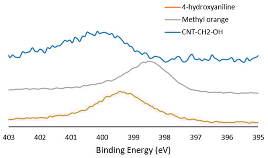 High-resolution N1s spectra for CNT–CH2–OH sample, pure 4-hydroxyaniline sample, and methyl orange (diazoic compound).