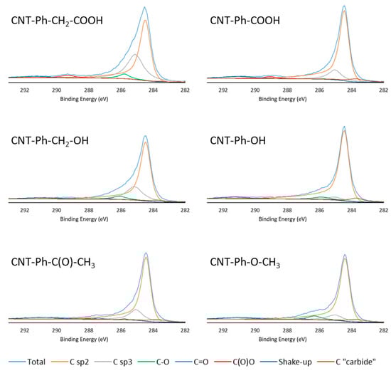 Figure 4 shows an increase in the Csp3 component in all functionalized samples. This increase was consistent with diazonium-mediated functionalization, as this modification transforms sp2 carbons of the CNT sidewall into Csp3 carbons [].