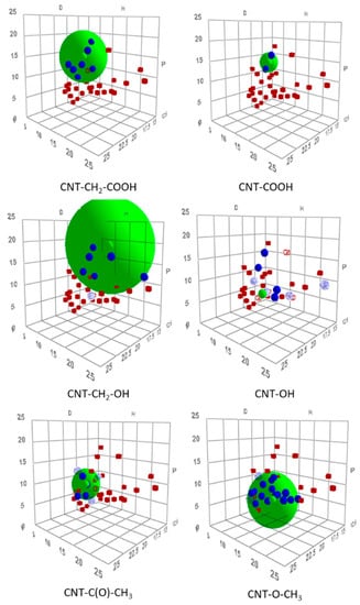 HSPs are a means to describe interactions between a solute and a solvent. Each compound is described by three parameters: A dispersion parameter, accounting for dispersion forces (δd); a polar parameter (δp), accounting for dipole–dipole interactions; and a hydrogen-bond parameter (δh). A solute and solvent that are characterized by close parameters are compatible and thus soluble in each other. By contrast, compounds with largely different parameters are immiscible. Therefore, it is possible to determine HSPs of an unknown compound by testing its solubility in several solvents with known HSPs. Some solvents appear to be “good solvents.” On a tridimensional plot (using the three parameters as axes), “good solvents” are encompassed by a sphere with a center corresponding to the solubility of the compound with unknown HSPs. HSP theory [] was proven to be applicable in the case of CNTs (crude and functionalized), and could therefore be used to characterize functionalized CNTs. Modified CNTs should be characterized by different HSPs from those of the starting material, and each functionalization produces CNTs with different parameters. HSPs were determined for six modified samples (Table 4), and the corresponding solubility spheres are shown in Figure 5.