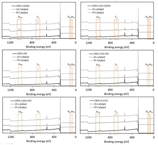 Table 6 and Figure 6 summarize the atomic percentages of various elements in 12 samples produced by the derivatization of six types of diazonium-modified CNTs using either zinc chloride or Karstedt’s catalyst. Figure 7 displays XPS comparisons of the samples’ survey spectra after derivatization with diazonium and silylesterification with either zinc chloride or Karstedt’s catalyst.
