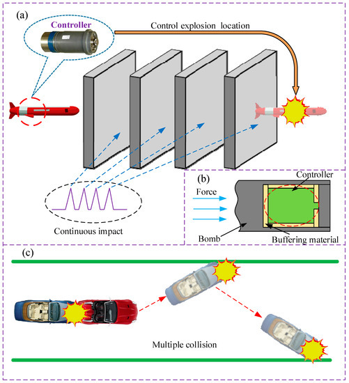 Recently, the material’s performance of energy absorption under extremely (high energy, up to tens of thousands of g) mechanical impacts have attracted much attention in many application fields such as the military, the vehicle, ballistic armor, and clothing industries. As demanded in the military field, the energy absorbing materials are applied to protect core electronic devices from extreme multi-impact, when the missile attacks buildings with multi-layer structures (Figure 1a,b) [1,2,3,4]. In automobile electronics, the energy absorption materials are also important for protecting the core electronics system in a collision accident or even the multiple-collision accident (Figure 1c). The mechanical impacts in these scenarios have extremely high energy and are repeated many times within milliseconds. Hence, the energy absorption material in such applications must have both high energy absorption characteristics and good recoverability (small attenuation of energy-absorbing ability of the material in multi-impact) synchronously, which raises a serious challenge.