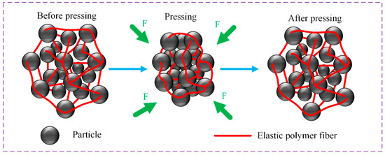 The proposed energy absorbing method is based on the composite of porous materials and elastic polymer materials. The microscale structural representation of the proposed composite porous material modified by an elastic polymer fiber network is shown in Figure 2. The particles of the porous material are connected by the elastic polymer fiber, thereby forming the micro-network structure. This material design is based on the following two principles. First, mass of the porous material is much larger than that of the polymer, in order to maintain high porosity and achieve high energy absorption characteristics. Second, the network structure of the polymer has a binding effect on the porous material particles, so that the particles can recover to their initial state after the extreme impact. Therefore, the mass-ratio optimization of polymer and the formation of polymer network structure are the key to improve the energy absorption characteristics of composite materials in extreme multi-impact, which are discussed thoroughly in the following part of this paper.