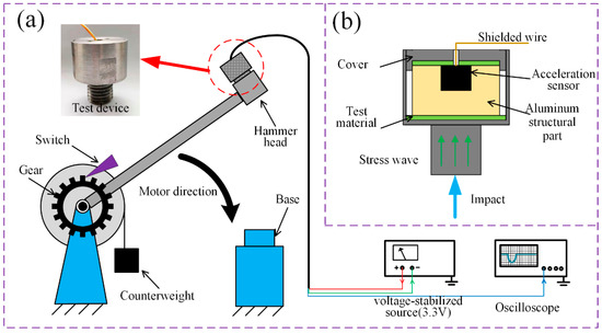 A machete hammer, an equipment for extreme impact tests (Figure 4a), is used in this paper. The kinetic energy, obtained from releasing the counterweight, accelerates the hammer bar, which is connected to the gear. Consequently, the hammer head, including the test device, hit the base at a certain speed. During the impact process, the speed of the hammer head decreases to zero rapidly within milliseconds, and the high acceleration is generated. As the hammer bar is connected to the gear, the release height can be controlled by adjusting the tap position number of the gear that turns.