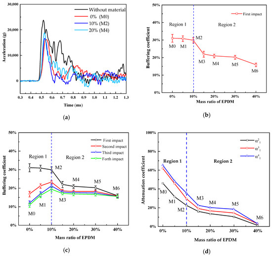 Moreover, multi-impact experiments are conducted for each kind of test materials, and the experimental results are shown in Figure 5c,d. Figure 5c compares the buffering coefficients of the test materials in the multi-impact process, and Figure 5d compares the attenuation coefficients. According to Figure 5c, in Region 1, the buffering coefficients of the test materials attenuate significantly with increasing number of impact processes for the same sample. In Table 2, the buffering coefficients of M0 (0%), M1 (5%), and M2 (10%) are 31.01%, 30.79%, and 29.86% during the first impact process, while they are 10.78%, 15.96%, and 19.30% during the fourth impact process, respectively. Hence, the buffering coefficients decrease by 20.23%, 14.83%, and 10.56%, respectively. According to Region 1 in Figure 5d, the attenuation coefficients of M0 (0%), M1 (5%), and M2 (10%) are 65.2%, 48.2%, and 35.4%, respectively. Thus, with increasing EPDM proportion, the attenuation coefficients of the test materials decrease significantly during the multi-impact process. In addition, the buffering characteristics of the multi-impact process improve clearly when the EPDM rubber proportion is less than 10%. Therefore, the buffering characteristics of M2 (10%) are better than those of M0 (0%) and M1 (5%) in the multi-impact process. When the EPDM rubber proportion is over 10%, the buffering coefficients of M3 (15%), M4 (20%), M5 (30%), and M6 (40%) are 21.91%, 20.88%, 20.14%, and 15.85% in the first impact process, respectively. However, by the time of the fourth impact, the buffering coefficients are 17.02%, 16.72%, 16.47%, and 15.4%, respectively. Thus, the buffering coefficients decrease by only 4.89%, 4.16%, 3.67%, and 0.45%, respectively. According to Region 2 in Figure 5d, the attenuation coefficients of M3 (15%), M4 (20%), M5 (30%), and M6 (40%) are 22.3%, 19.9%, 18.2%, and 2.8%, respectively. Evidently, with increasing EPDM rubber proportion (over 10%), the attenuation coefficients of the test materials continue to decrease, and the buffering characteristics of the multi-impact improve. However, because the buffering coefficients of M3 (15%), M4 (20%), M5 (30%), and M6 (40%) in the first impact process decrease evidently compared to that of M2 (10%), their energy-absorbing characteristics () during the multi-impact processes remain weaker than that of M2 (10%), in spite of the lower attenuation coefficient.