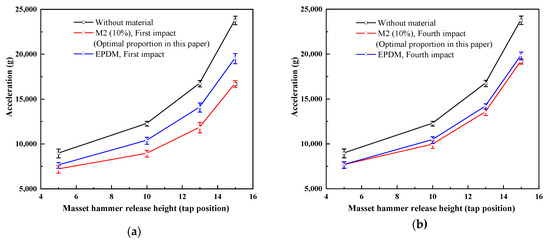 To highlight the advantages of the composite material M2 (10%), the polymer (EPDM rubber) and traditional porous materials (foamed copper and foamed nickel) are investigated in comparative tests. EPDM rubber is a typical hyper-elastic material, which can produce the strain far exceeding the elastic limit strain under the action of external forces, and of which the train can be restored to the original state during unloading [17]. More specifically, the energy absorption characteristics of M2 (10%) are compared with those of the EPDM rubber during the multi-impact process with overloads of different amplitudes, which are realized by changing the release height of the hammer rod. Four cases with 5, 10, 13, and 15 tap positions are conducted, respectively; the average peak of each height is determined through multiple tests. Figure 6a presents the impact peak values corresponding to different tap positions during the first impact process. In Figure 6a, the unbuffered peak values of the release heights for 5, 10, 13, and 15 tap positions are 8937 g, 12,250 g, 16,723 g, and 23,766 g, respectively. After buffered by M2 (10%), the peak values decrease to 7163 g, 8907 g, 11,815 g, and 16,670 g, and the buffering coefficients become 19.8%, 27.3%, 29.3%, and 29.8%, respectively. However, after buffered by the EPDM rubber, the peak values decrease to 7608 g, 10,360 g, 14,060 g, and 19,510 g, and the buffering coefficients become 14.87%, 15.4%, 15.9%, and 17.9%, respectively. Clearly, the buffering coefficient of the EPDM is lower than that of M2 (10%) during the first impact process of the same height. Figure 6b presents impact peak values corresponding to different tap positions during the fourth impact process. According to the figure, the buffering coefficient of M2 (10%) is still higher than that of the EPDM in the fourth impact process. Clearly, although the rubber is very elastic, its energy absorption characteristics are inferior to those of the composite material M2 (10%).