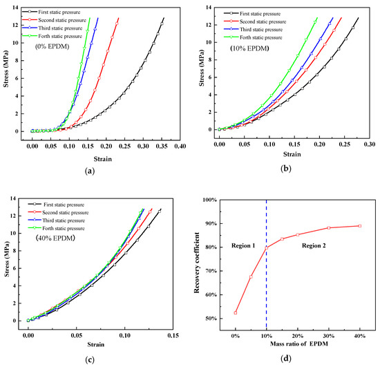 (a–c) Stress–strain curves of M0 (0%), M2 (10%), and M6 (40%) during four loading steps, respectively; (d) Relationship between recovery rate of multiple loadings and mass ratio of EPDM rubber.