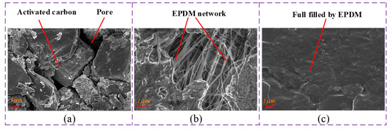 (a–c) SEM images of pure activated carbon film, activated carbon film containing 10% EPDM rubber, and activated carbon film containing 40% EPDM rubber, respectively.