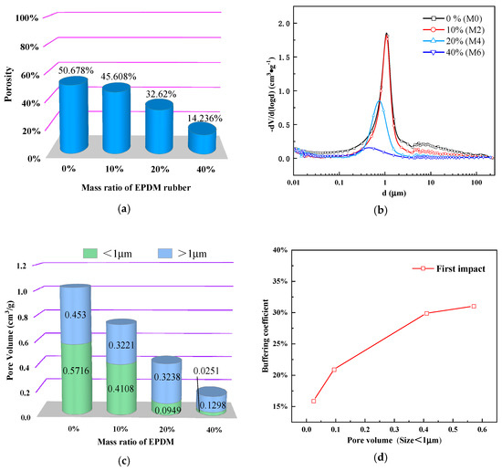 (a) Porosity of test materials containing different mass ratios of EPDM rubber; (b) Pore size distribution; (c) Pore volumes of test materials containing different proportions of EPDM; (d) Relationship between buffering ratio and pore volume (size < 1 ).