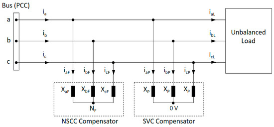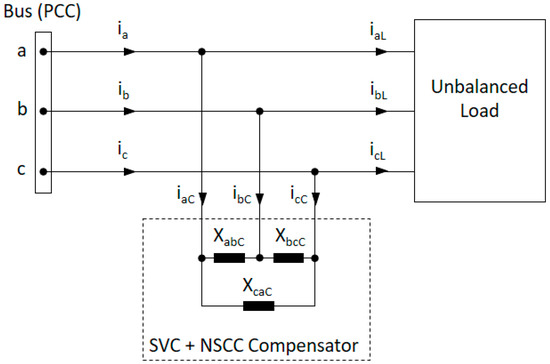 As Figure 2 shows, to compensate for the unbalanced apparent power , we use the NSCC compensator from reactive elements (coils and/or capacitors). In this case, the compensator reactance values (, and ) are different in each phase, because the positive-sequence voltage and negative-sequence current have different sequences.