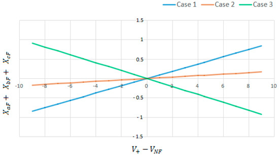 To include the condition defined in Equation (19), we graphically analyse different case studies, where we vary the characteristics of the loads as well as the line-to-line voltages. Figure 3 shows the relation between the difference in the modules (for ), and the sum of the compensator reactances , and . It is observed that regardless of the characteristics of the load and the voltages, the sum of the reactances is null when the difference in the modules . This implies that Equation (19) is true when the modules of and are equal. Considering this condition in Equations (22)–(24), and generalizing for , Equation (25) is obtained.