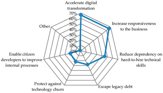Based on the ‘The State of Application Development’ report [3] that shows the results obtained through a survey answered by more than 3300 IT professionals across different continents, the main reasons for using low-code development platforms are detailed in Figure 1. Of the respondents, 66% chose accelerate digital transformation and increase responsiveness to the business as the main motives why they use or will use low-code development platforms; 45% of the surveyed professionals pointed to the reduction of dependency on hard-to-hire technical skills.