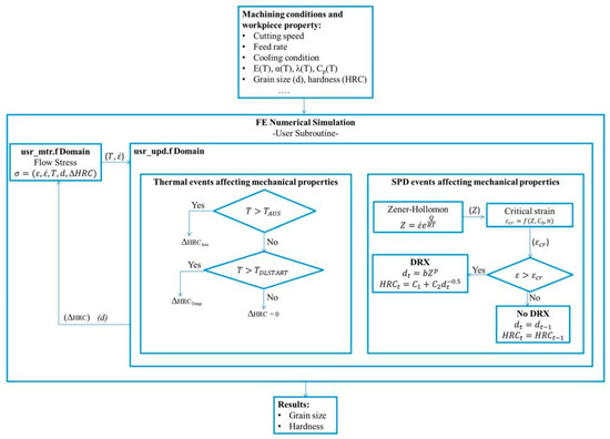 Concerning thermal contribution, the user subroutine “Thermal events” (Figure 2) evaluates the local temperature history in the deformation zone, chip and machined surface, and determines the phase transformation (based on an empirical formulation relating hardness variation to quenching and tempering phenomena).