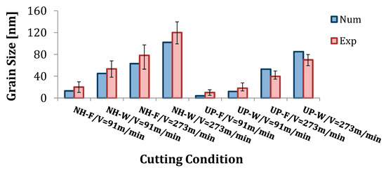 On the contrary, experiments show a grain size increase (i.e., coarser grain size) with the increase of the cutting speed (Figure 4). Thus, the FE model allows observation of increasing temperatures when the cutting speed rises, as seen in Figure 6.