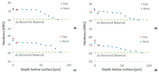 Figure 10 reports the hardness numerical profile from the machined surface to the bulk material. All the investigated cutting conditions highlighted a hardened layer of about 80 µm. Moreover, a good agreement between the prediction and the experimental evidences was recorded near to the machined surface (at 6 µm).