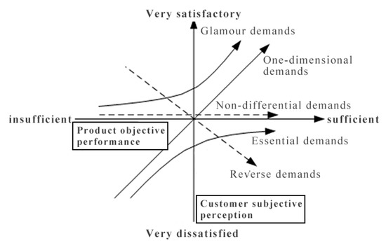 Japanese expert Noriaki Kano proposed the Kano model theory based on the two-dimensional cognitive model. The Kano model classifies the quality characteristics of a product or service into five categories: Attractive Quality, One-dimensional Quality, Basic Quality, Indifferent Quality, and Reverse Quality. The customer’s needs are met by product or service quality characteristics, so the Kano model’s division of the product’s quality characteristics can be equated with the product’s ability to meet customer demand levels and trends. Customer needs can also be divided into five types of requirements, as shown in Figure 2.