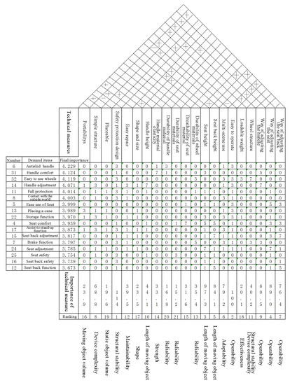 In addition, the details of Figure 3 about the HOQ are summarized as follows: first of all, QFD is a user-driven product development method that uses a systematic and standardized approach to investigate and analyze user needs. In particular, the HOQ is a tool component that implements this method during product development. In order to make more clear about the Figure 3, three steps of the TRIZ-Kano-QFD are discussed by questionnaire surveys and the target user interview. Based on the preliminary results, further user interviews were conducted, which consider the Kano model to obtain demand for the value of user needs. Finally, the QFD theory was applied to convert user needs into technical features: (1) classification and importance evaluation of demand attributes based on the Kano model are considered; (2) the demand transformation based on the QFD model is estimated; and, (3) according to user demands and technical characteristics obtained by QFD, HOQ technology is utilized to determine measure weights and design conflict. Satisfying the charm demand allows users to maintain high satisfaction with the product, and the charm demand corresponds to the future development of the product. TRIZ technology evolution theory can be used to study the life cycle position of products and the past development process of product technology systems, and then explore the future development direction of product technology systems. Comprehensive use of the future development direction of the technology system to predict new product features can keep the product iteratively updated at all times [43]. Using TRIZ technology evolution theory to solve the technical characteristics of strong correlation, high importance, and no conflicts related to the glamour demand can make the product beneficial to the invincible.