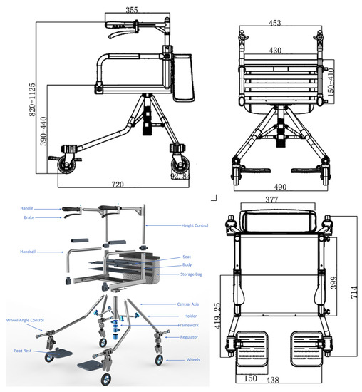 Novel designed four-wheeled rollator (mm).