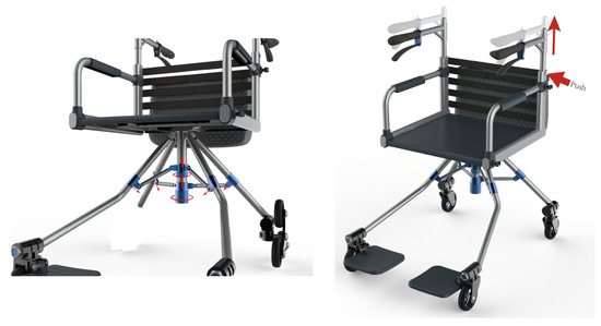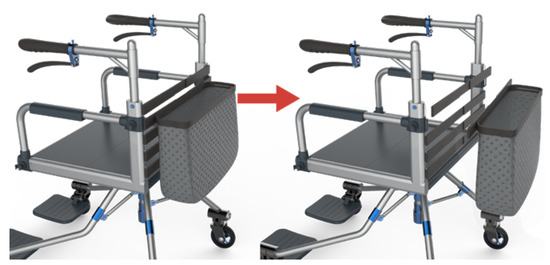 According to the previous analysis of the problem conflict points, technical characteristics and requirements, the Kano type selects the corresponding TRIZ tool to analyze the problem solution and apply the problem solution to the design practice of the four-wheel unpowered walker. At the same time, the design elements and man-machine size of the walker product were analyzed to obtain the final product design [44,45]. Finally, through the sketch and computer-assisted expression, the structure, details, and the color of the product are refined, and the product drawing is completed through the rendering. Thus, the specific mechanical structure of the four-wheeled rollator is shown in Figure 4. The flexible mechanical structure makes the walker more adaptable. For example, in the assisted walking state, the user can push the rollator to walk, so the handle of the rollator must be in the same direction as the seat. At the same time, to support the user with enough space for movement and avoid restrictions on seats, the seats and foot pedals have a retractable capacity, which is convenient for users to walk.