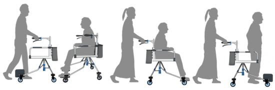The height of the walking aid handle can be adjusted, and six adjustment card positions are designed, corresponding to the handle height of the walking aid: 820 mm, 881 mm, 942 mm, 1003 mm, 1064 mm, and 1125 mm. The seat-back is composed of a plurality of backrest strips, and the ends of the backrest strip are velcro for easy installation and disassembly. Five slots are provided on the walking aid frame, and the backrest strips are tightened through the slots to form a backrest. A storage bag and one of the backrest strips are connected to form a detachable storage bag. There are three usage states for the developed rollator system, including the assisting the walking situation, serving in walking the rest, and the wheelchair with the partner pushing, as displayed in Figure 7.