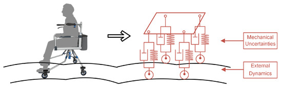 In this article, uncertainties in rollator systems we considered can be separated into two sections, namely internal interaction and external uncertainty, as exhibited in Figure 8. The former mainly involves the situation where the parameters such as quantity and rotational inertia of the mechanical system are unknown, while the following mainly belongs to some unmodeled dynamics such as external disturbance and friction. When it comes to the rollator operating system of the developed rollator for tracking control, it is essential to consider the model nonlinearity and external interaction, such as structure parameter, load transfer, and uneven terrain.