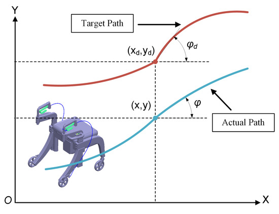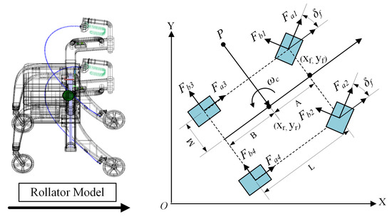 The kinematical model of the assisted elderly rollator is displayed in Figure 9. and denote the coordinate of the rear axis and front axis, respectively. and represent the steering angle and yaw angle, respectively. P denotes the circle center, R is the steering radius, and L and M represent the wheel track. In addition, the speed of the rear and front are the and , respectively.