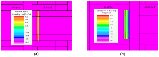 The physical mechanism of DMMG-HJLTFET is explained in Figure 2a–d and Figure 3a,b. Figure 2a,b shows the BTBT rate of electron and hole of DMMG-HJLTFET when Vds = 1 V. It is obvious that BTBT occurs at source and channel interface, and the rate of BTBT increases significantly due to heterojunction between source and channel. Figure 2c shows the electric field distribution when Vgs = 2.0 V and Vds = 1.0 V, it is not difficult to find that the value of electric field is markedly improved near hetero junction and hetero dielectric, resulting in a higher ON-state current and a lower OFF-state current in DMMG-HJLTFET. Figure 2d shows the total current density of DMMG-HJLTFET when Vgs = 2.0 V and Vds = 1.0 V, as can be seen from the Figure 2d, the current mainly flows in the middle region of this device, introducing the sandwich stack structure (GaAs/Si/GaAs) for DMMG-HJLTFET not only guarantees the large ON-state current, but also guarantees the small OFF-state current, which benefits from combining the advantages of silicon and GaAs.
