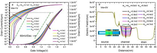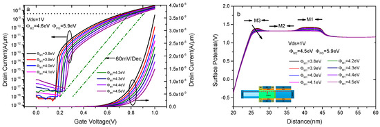 Figure 9a–d shows the impact of auxiliary gate work function (ΦM1) and tunnel gate work function (ΦM3) on transfer characteristics, surface potential, electric field and band diagram with keeping ΦM2 = 4.6 eV and ΦPG = 5.9 eV. It can be found through the observation of Figure 9a that the ON-state current of DMMG-HJLTFET decreases and the OFF-state current of DMMG-HJLTFET increases with the increase of auxiliary gate work function, i.e., appropriate selection for auxiliary gate work function should be small in terms of ON-state current. At the same time, the surface potential and electric field are also markedly influenced by auxiliary gate work function, as shown in Figure 9b,c, it can be notified that the DMMG-HJLTFET exhibits higher surface potential and electric field at the position of M1 and M3 with small auxiliary gate work function, which helps M1 suppress the ambipolar leakage current and reduce hot carrier effects (HCEs) by diminishing lateral electric field at drain/channel interface together with SiO2 near the drain and helps M3 improve the ON-state current by increasing the tunneling probability at source/ channel interface, as a result, a higher tunneling rate at the source/channel interface and higher barrier height at drain/channel interface are introduced simultaneously, as shown in Figure 9d. So, auxiliary gate work function should be small in terms of ON-state current and OFF-state current, and the auxiliary gate work function should be large in terms of barrier height at drain/channel interface. All things considered, the optimal value of auxiliary gate work function is chosen as 4.1 eV.