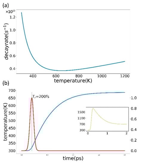 Taking the time Tr when the electric field of the incident pulse gets its maximum as reference, our simulation starts 200 fs earlier than Tr. After substituting the electric field amplitude in Equation (5) and the pump intensity P in two-temperature model into Equation (3) by , we then plot the temperature fluctuation over time in Figure 2b. Figure 2b shows the electron temperature increases dramatically at the beginning, while the lattice temperature lags much later, that it cannot reach 600 K within the first 0.5 ps. The temperature in Equation (11) corresponds to the lattice temperature because the ISC rate is associated with vibration of nucleus. Constrained by the pulse width of the incident laser, the Rabi oscillation and ISC mainly occur within 0.5 ps. Hence, the ISC rate keeps decreasing within the first 0.5 ps.